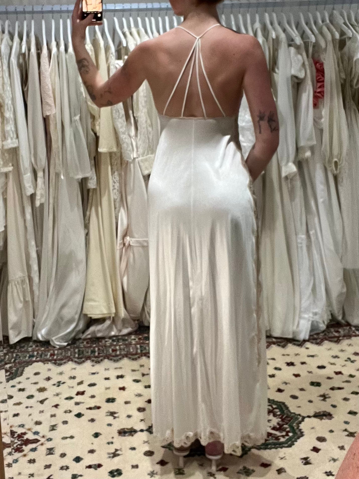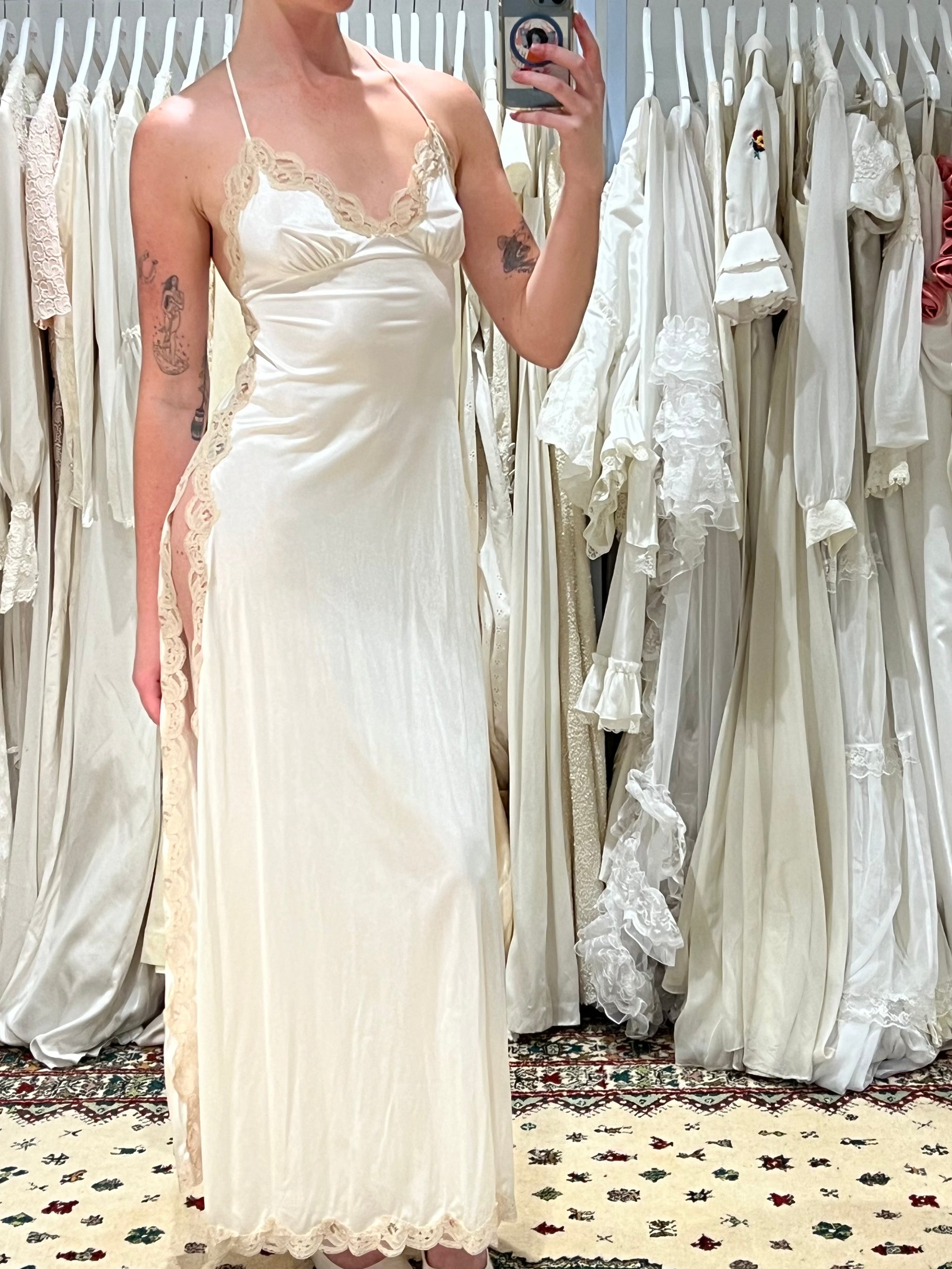We have sourced the most stunning bridal slip - introducing the 70s Cream Lace Slip and Jacket. This playful set features a delicate spaghetti strap halter slip with scalloped lace along the v-neckline and a flirtatious thigh-high slit trimmed in lace. The open back’s triangular strap design adds a fun twist, while the matching jacket with 3/4 sleeves ties up at the bust for a but of modesty. Made from buttery-soft fabric, it’s the perfect getting ready dress for your wedding day.