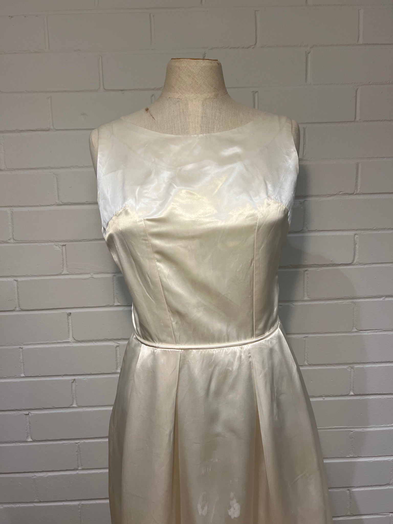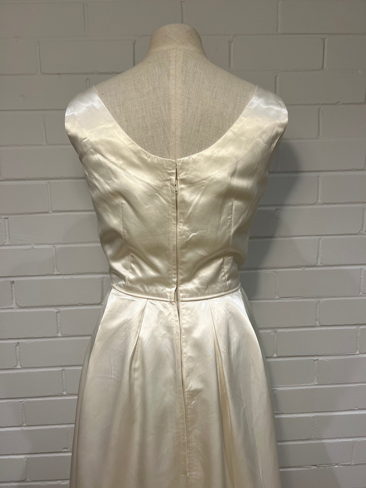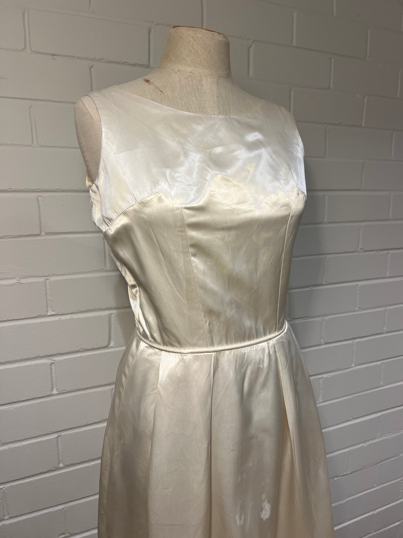 This 1950s Champagne Satin A-line dress features a boat neckline and a fitted bodice that accentuates the waist with elegant pleats flowing into a floor-length skirt. Crafted from soft satin, it drapes beautifully and emits a subtle glow. The flattering low V-shaped back adds a touch of allure, while the timeless vintage silhouette and flattering blush colour offers versatile styling options for the discerning bride seeking classic sophistication and a very Audrey Hepburn inspired look.