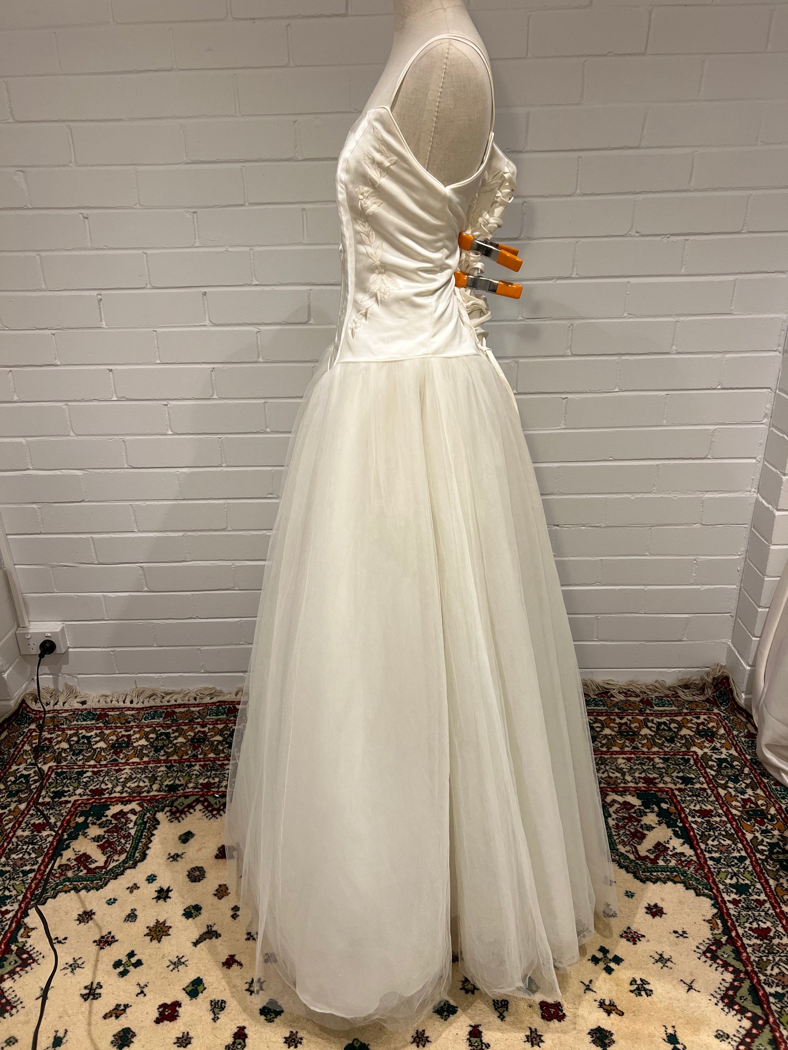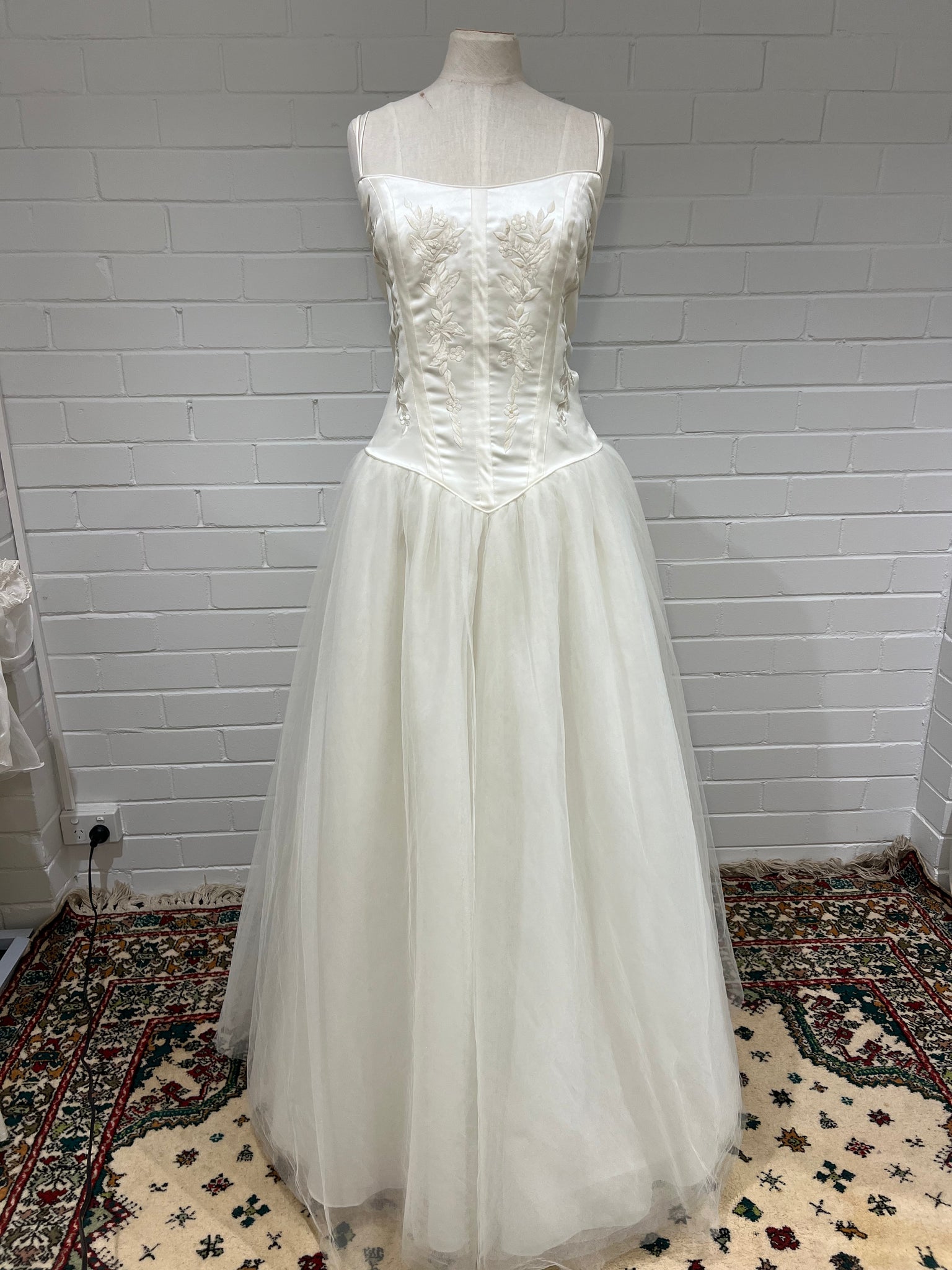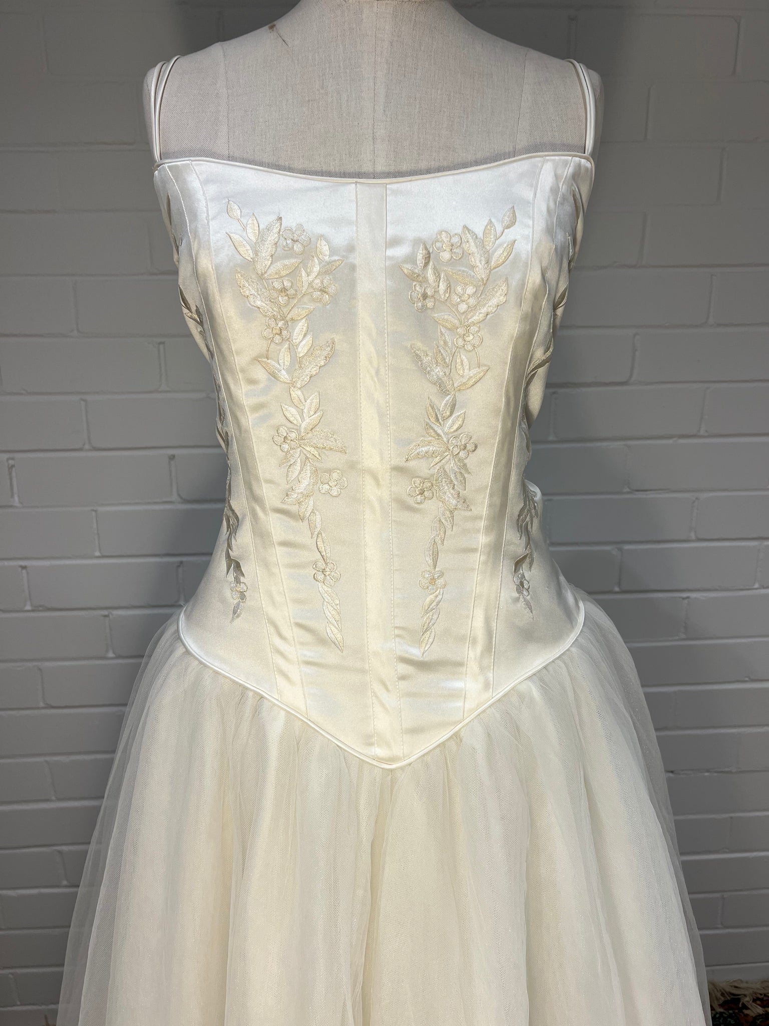 This 90s Embroidered Corset Tulle Skirt Dress features an elegant neckline and delicate double spaghetti straps, blending vintage charm with modern sophistication. The fitted corset is intricately embroidered and highlights a flattering low basque waistline, while the lace-up back allows a custom fit. A full, floor-length tulle skirt adds graceful movement and just the right amount of drama for a truly unforgettable look.