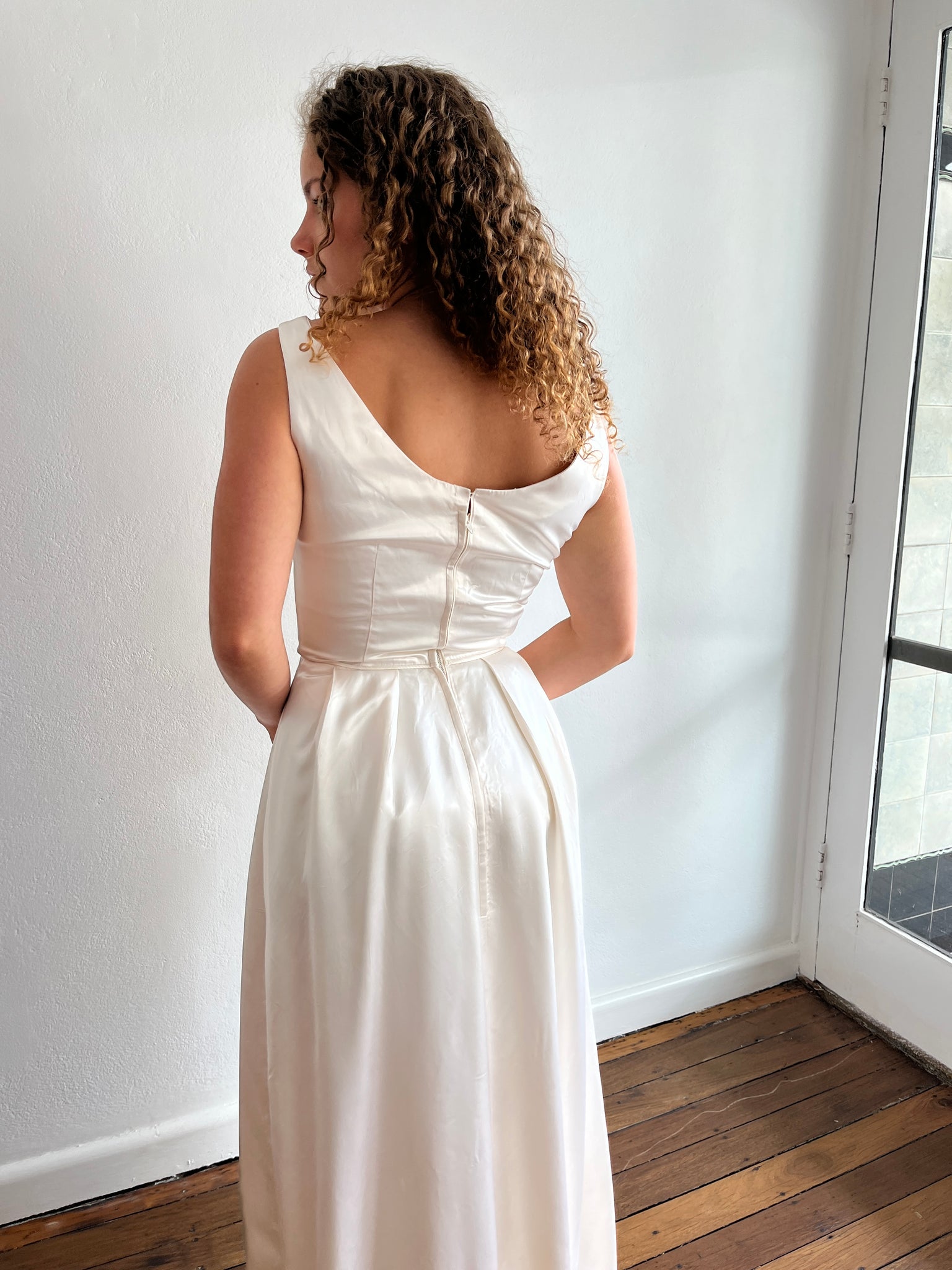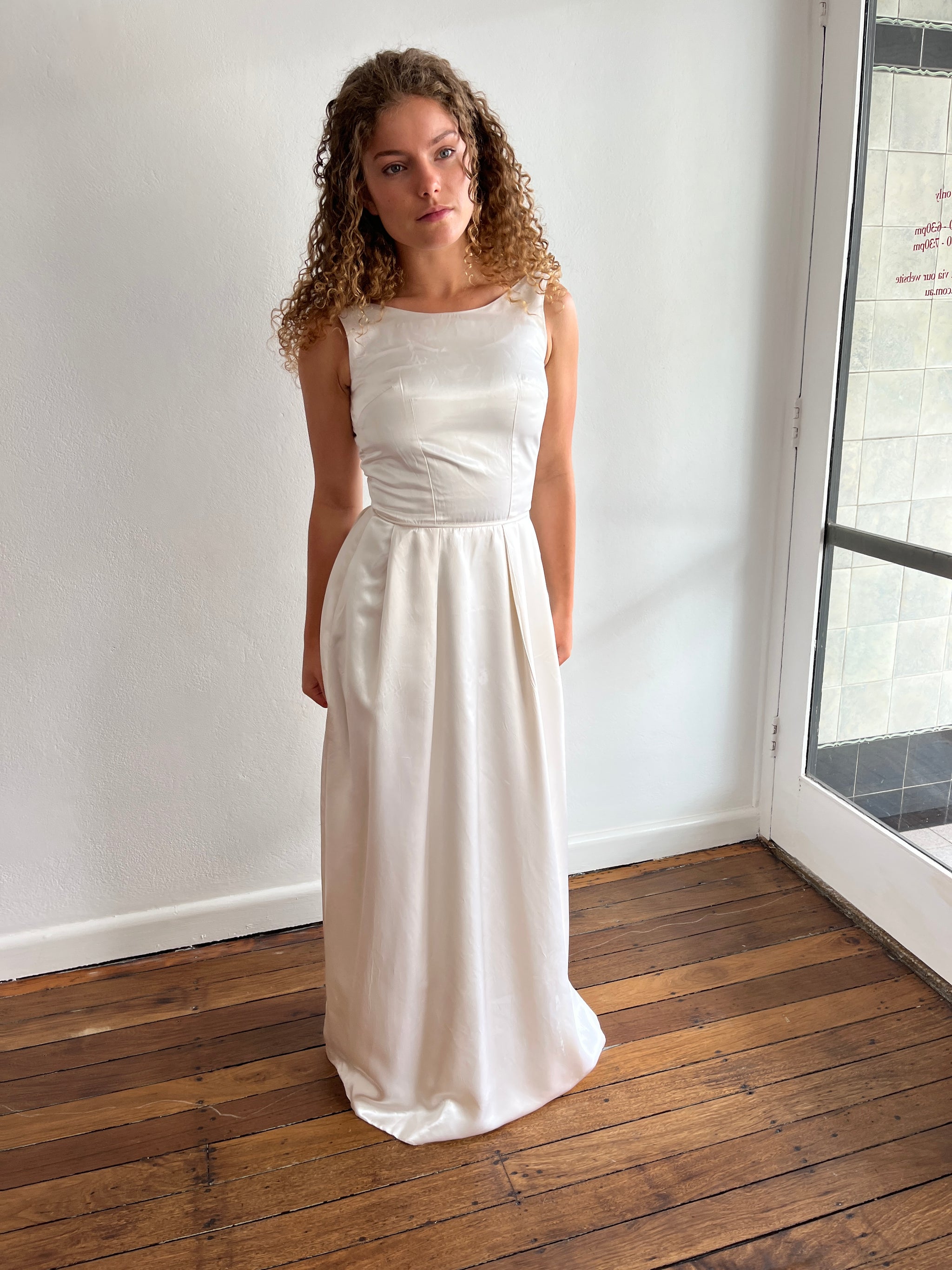 This 1950s Champagne Satin A-line dress features a boat neckline and a fitted bodice that accentuates the waist with elegant pleats flowing into a floor-length skirt. Crafted from soft satin, it drapes beautifully and emits a subtle glow. The flattering low V-shaped back adds a touch of allure, while the timeless vintage silhouette and flattering blush colour offers versatile styling options for the discerning bride seeking classic sophistication and a very Audrey Hepburn inspired look.