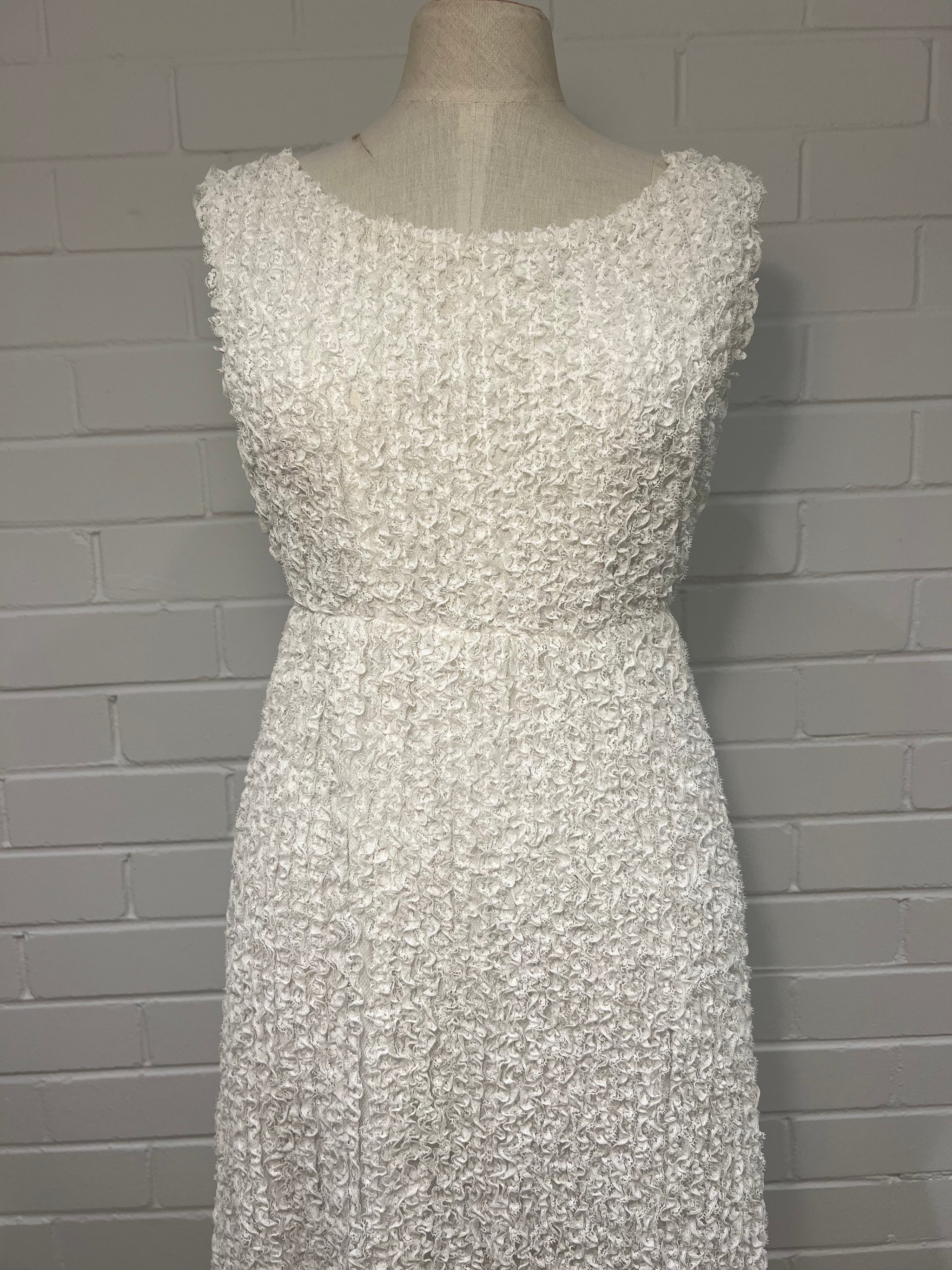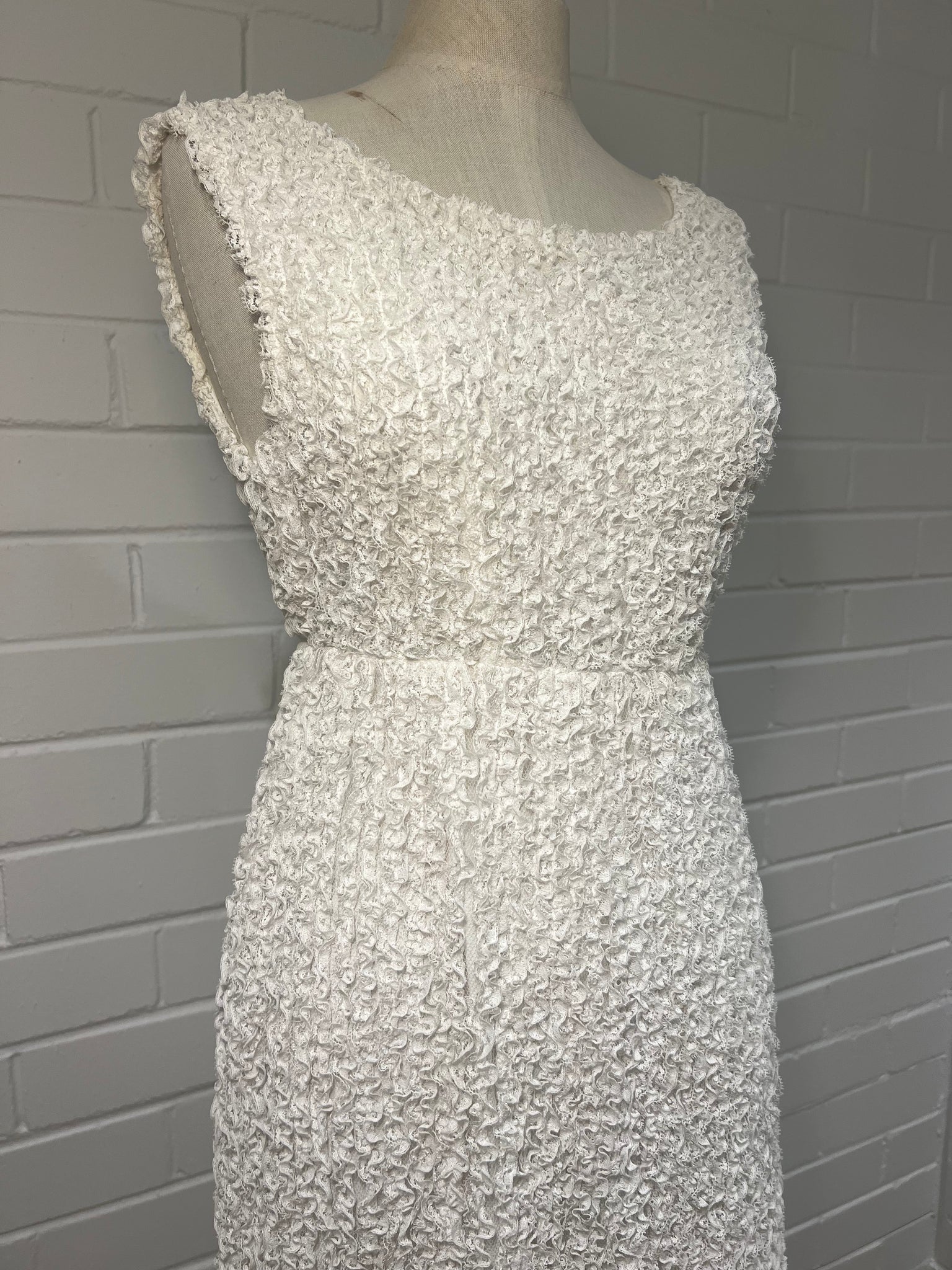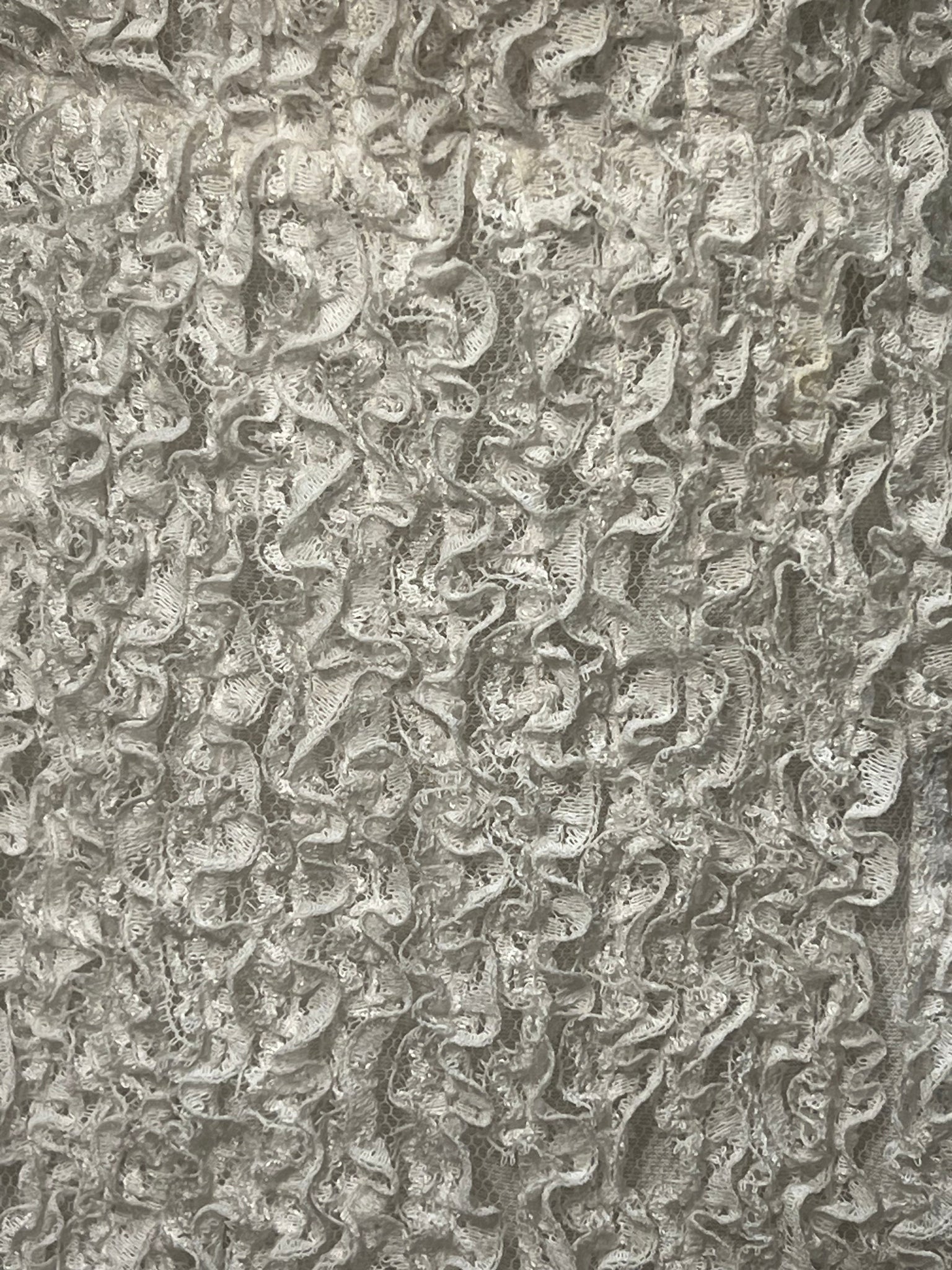 the 60s Lace Ruffle Shift Dress is simple, classy and timeless. Featuring a bateau neckline and a fitted bodice, this floor-length gown highlights a high waistline and the iconic shift silhouette of the era. Draped in delicate lace ruffle overlay from head to hem, it channels the refined grace of Audrey Hepburn, making it a perfect vintage choice for your wedding day or bridal occasion.