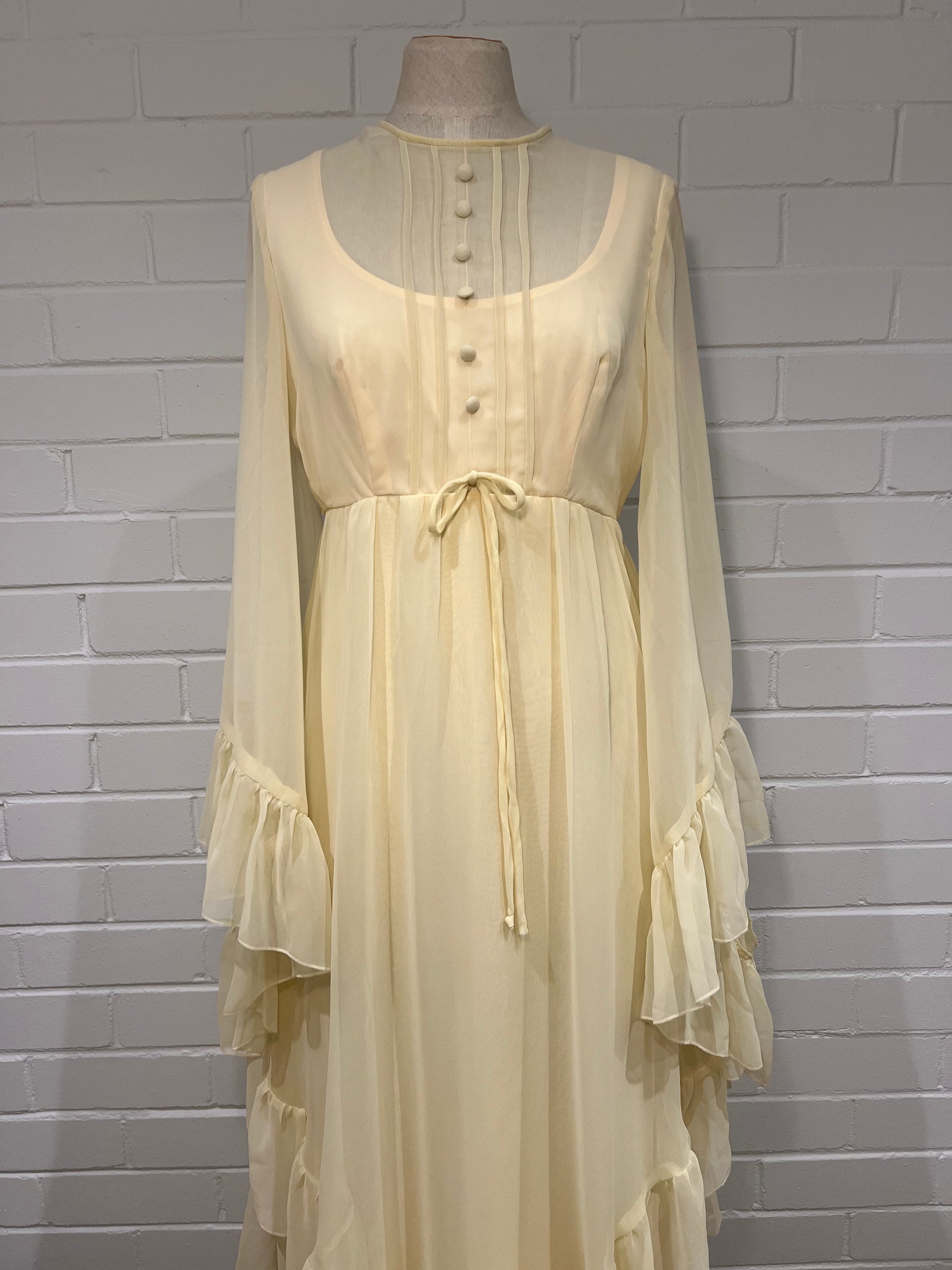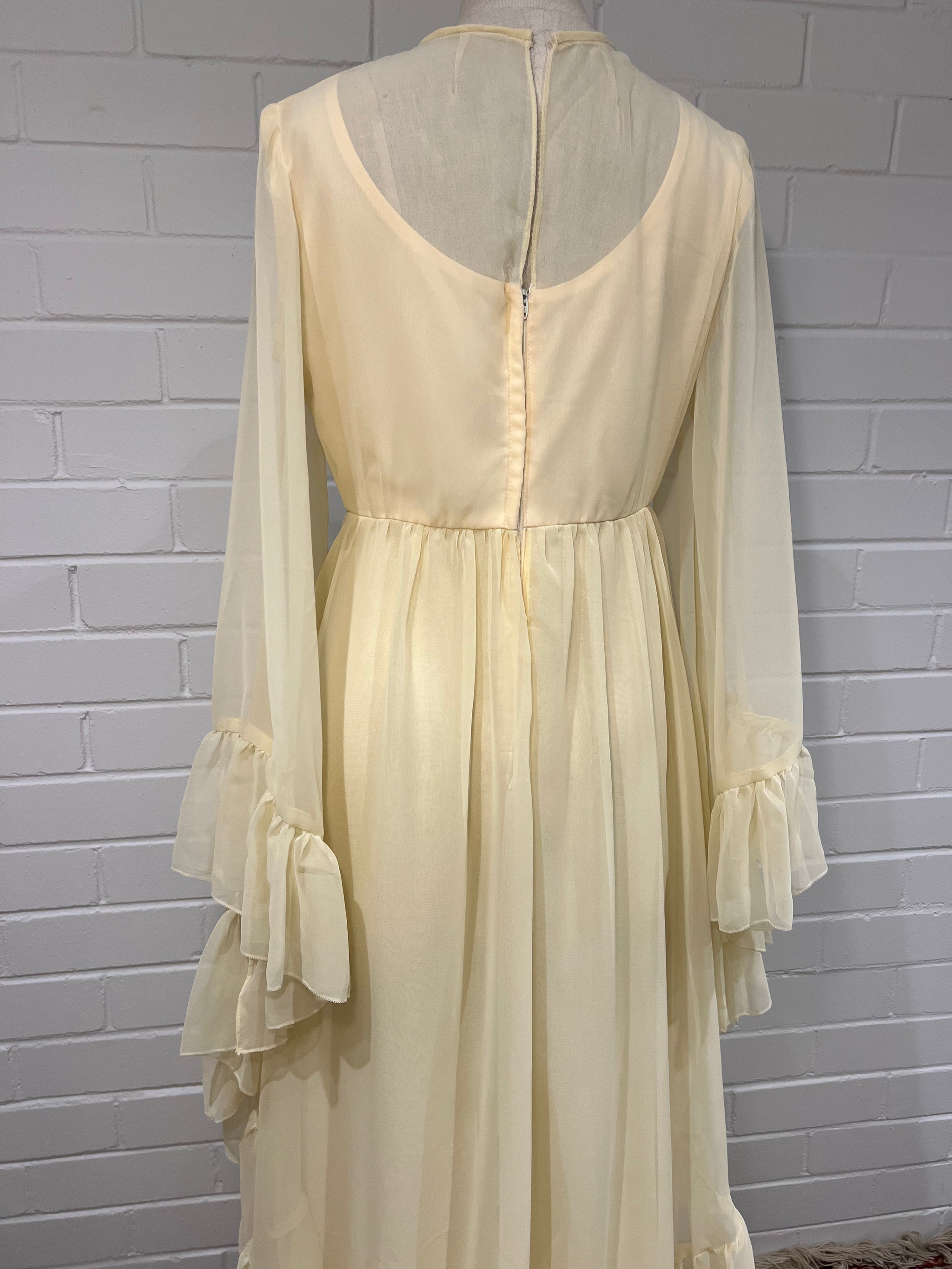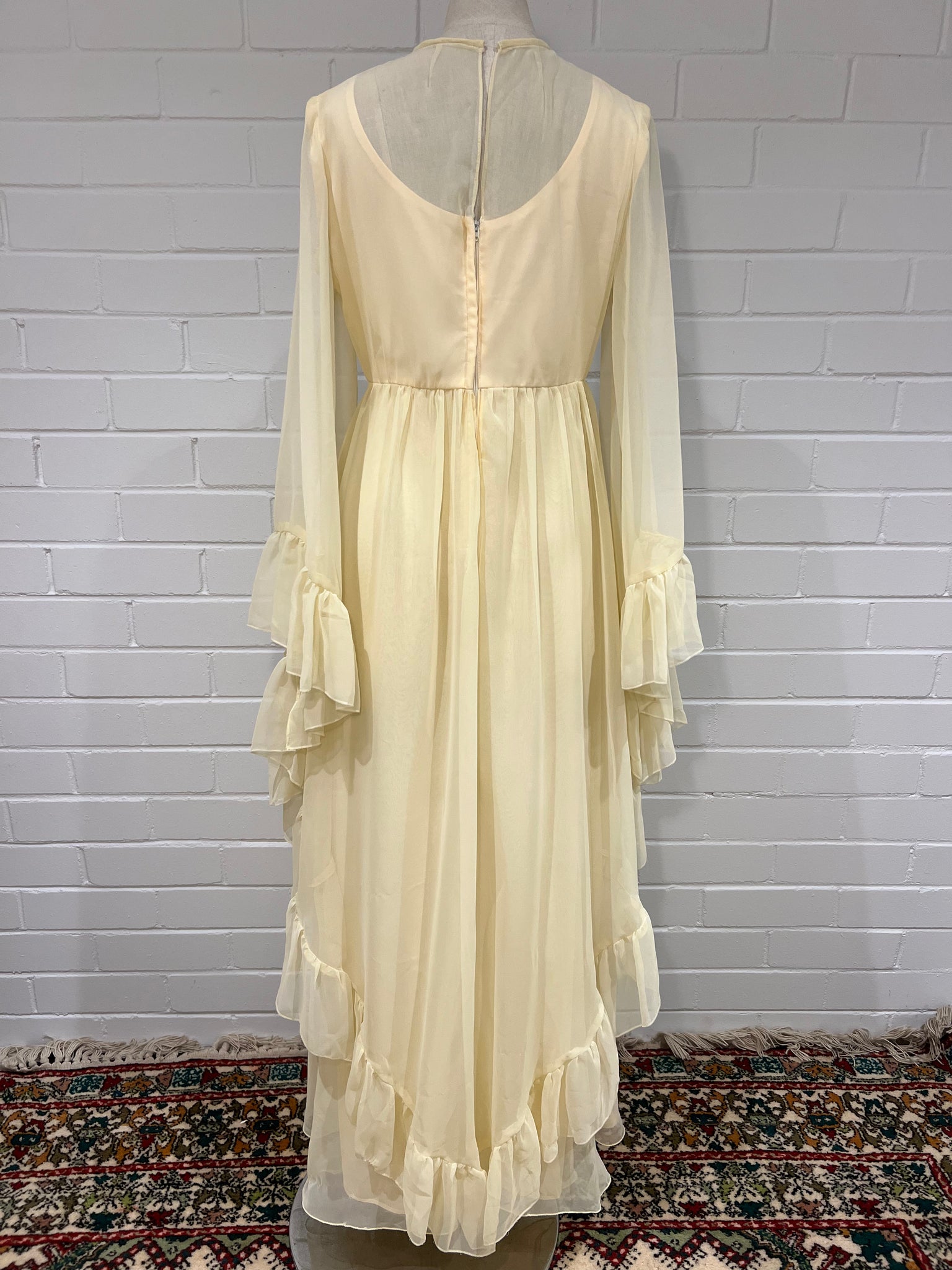 This dreamy 70s Cream Ruffle Bell Sleeve Dress is such a dream. Featuring a chiffon mock neckline with playful button details, a flattering high waistline with a mock belt, and long bell sleeves adorned with whimsical ruffles, it’s all about flowy, feminine vibes. The floor-length A-line skirt boasts a high-low chiffon overlay edged with ruffles, creating an ethereal silhouette that dances with every step. Perfect for turning heads and feeling effortlessly chic!