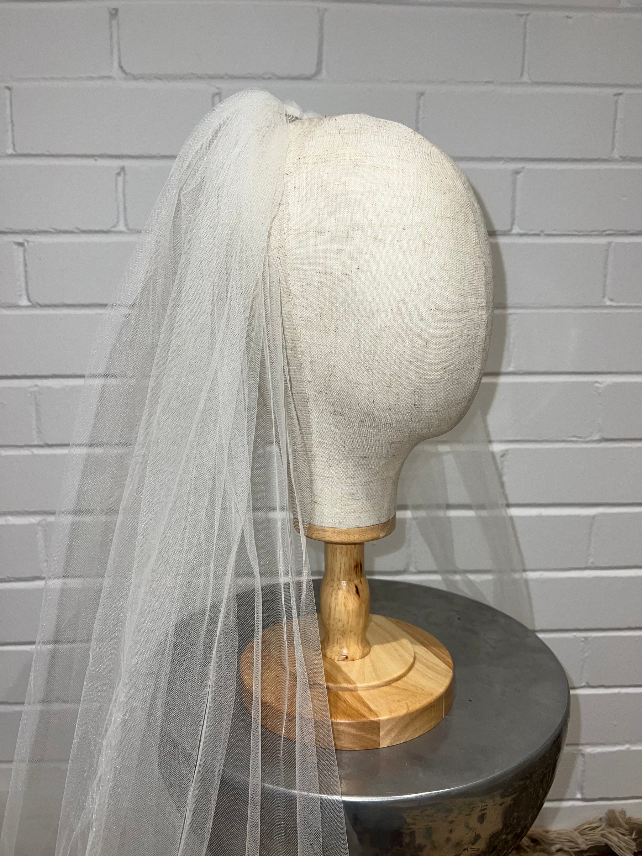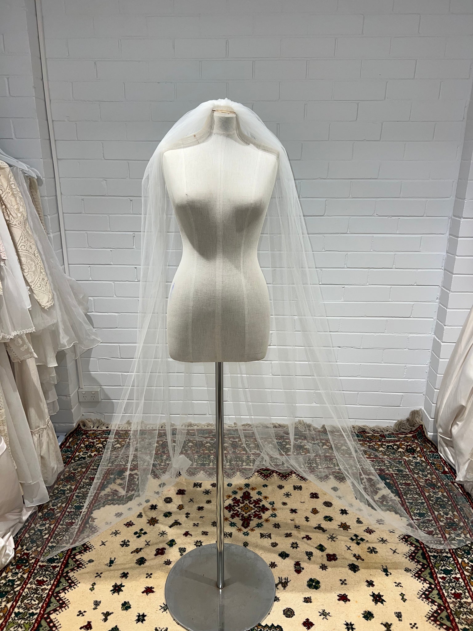 Add a vintage touch to your bridal look with our 1970s Single-tier Cathedral Veil. With a simple and elegant design, this veil is perfect for any hair-do. The high-quality tulle of the veil floats beautifully and can compliment the dress underneath to add the cherry on top of your bridal ensemble. The clip keeps it securely in place, making it an easy choice for your special day.