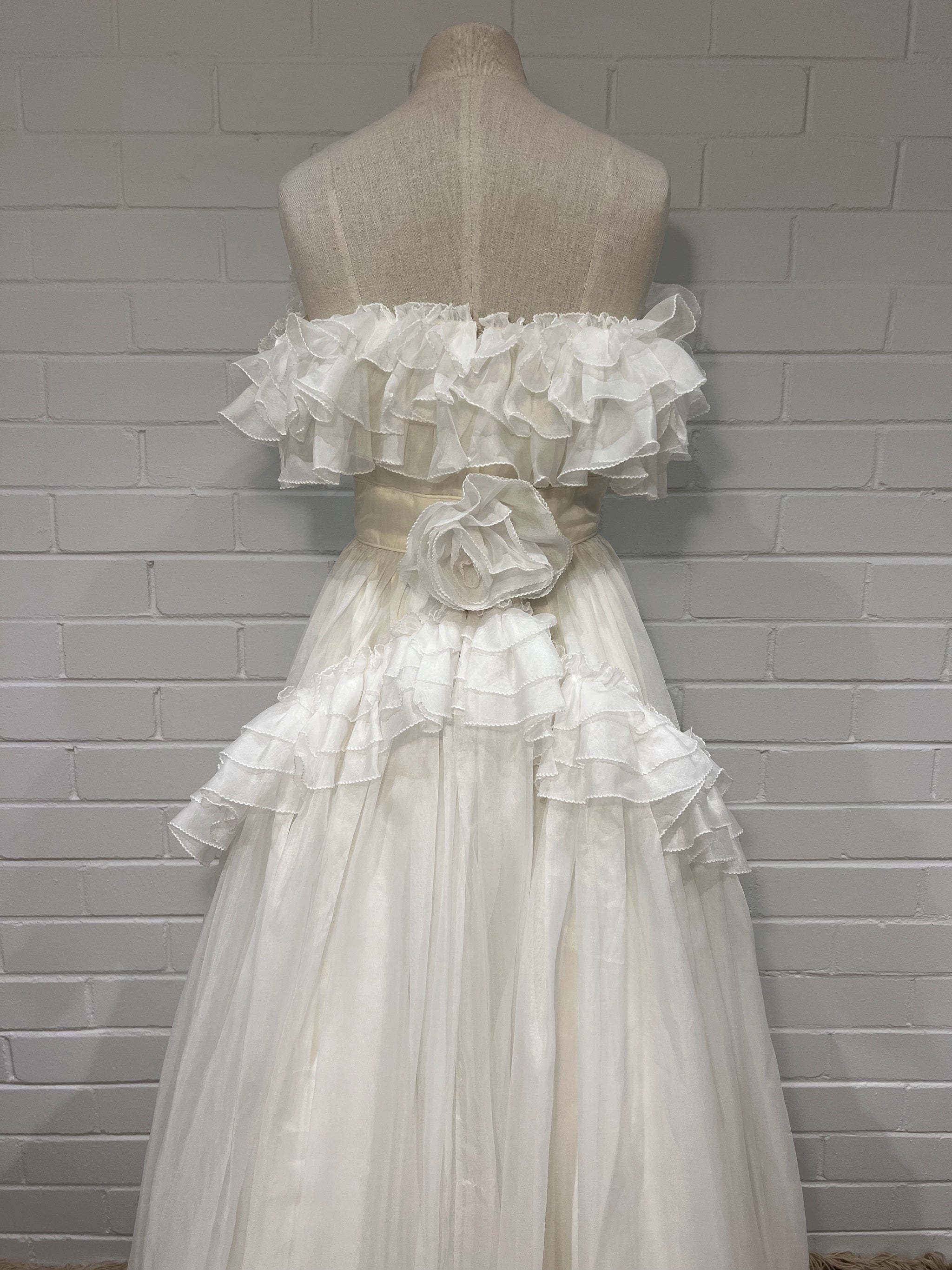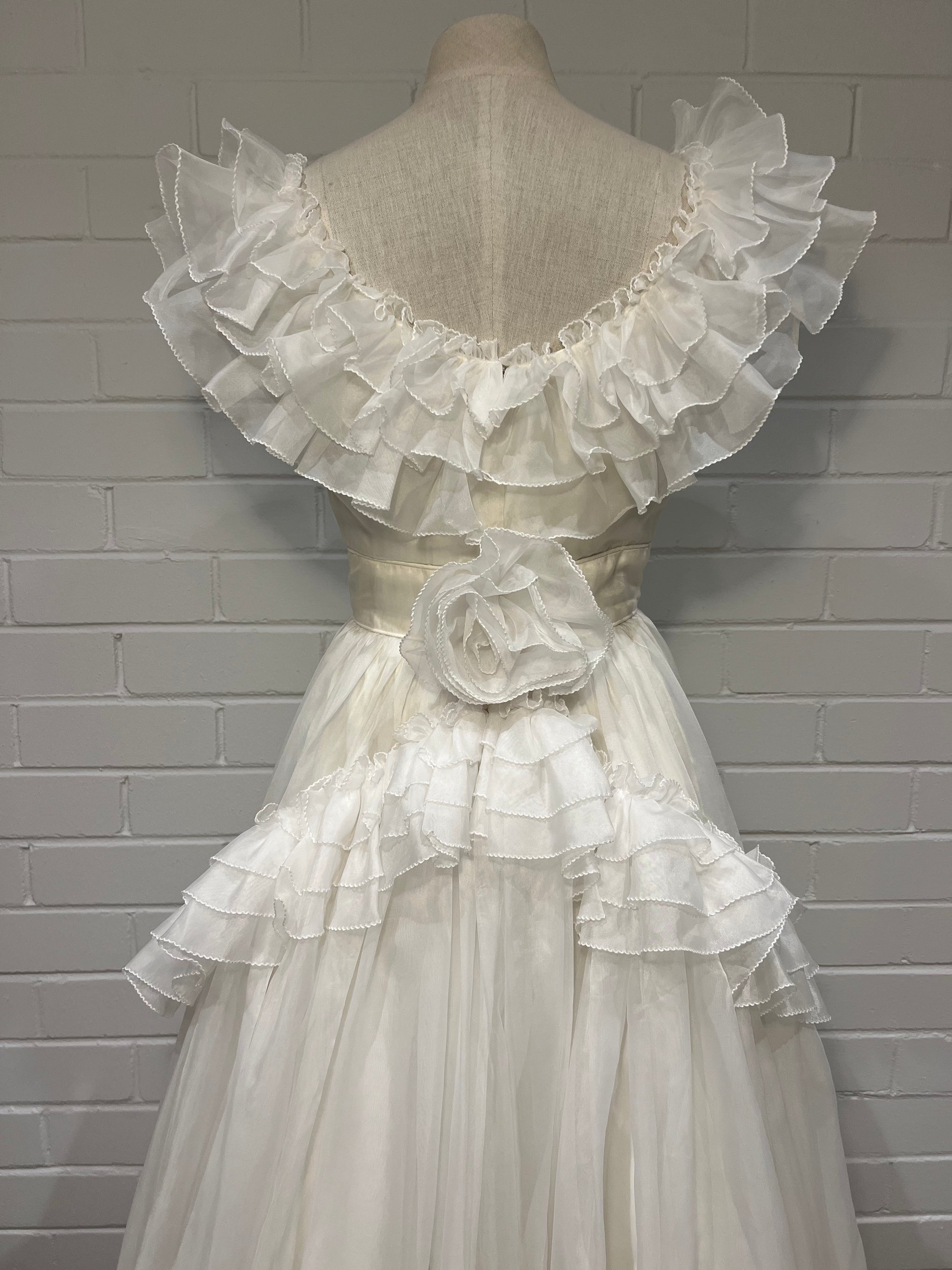 Introducing the 80s Off-the-shoulder Ruffle Dress. Featuring a versatile neckline with tiered ruffles, the sleeves can be styled on or off the shoulders for a refined look. The fitted bodice and cinched high waist, accentuated by a mock-belt, create a flattering silhouette. A full-length skirt adorned with tiered ruffles flows gracefully, while a delicate rosette at the back waist adds a subtle, sophisticated detail. Perfect for making a memorable statement with classic charm.