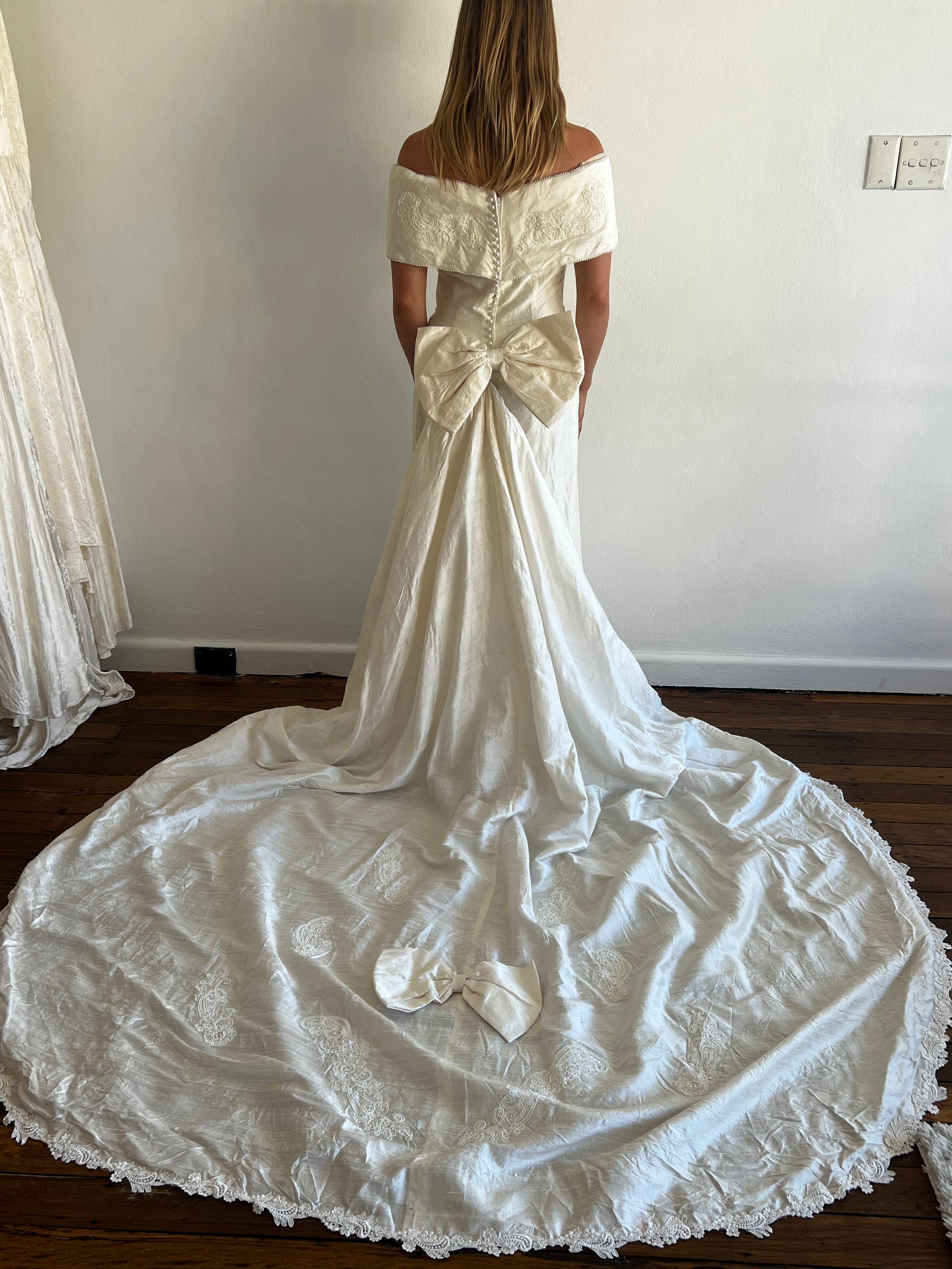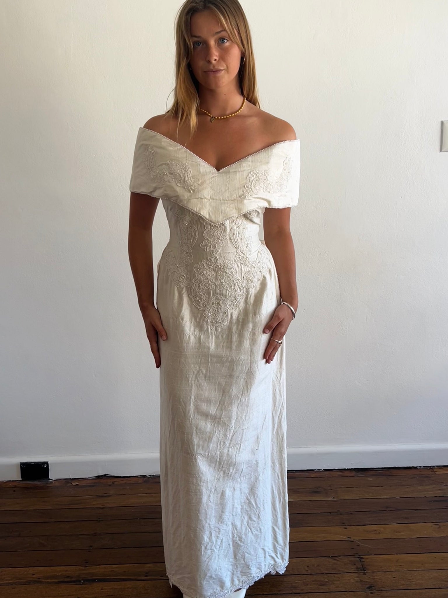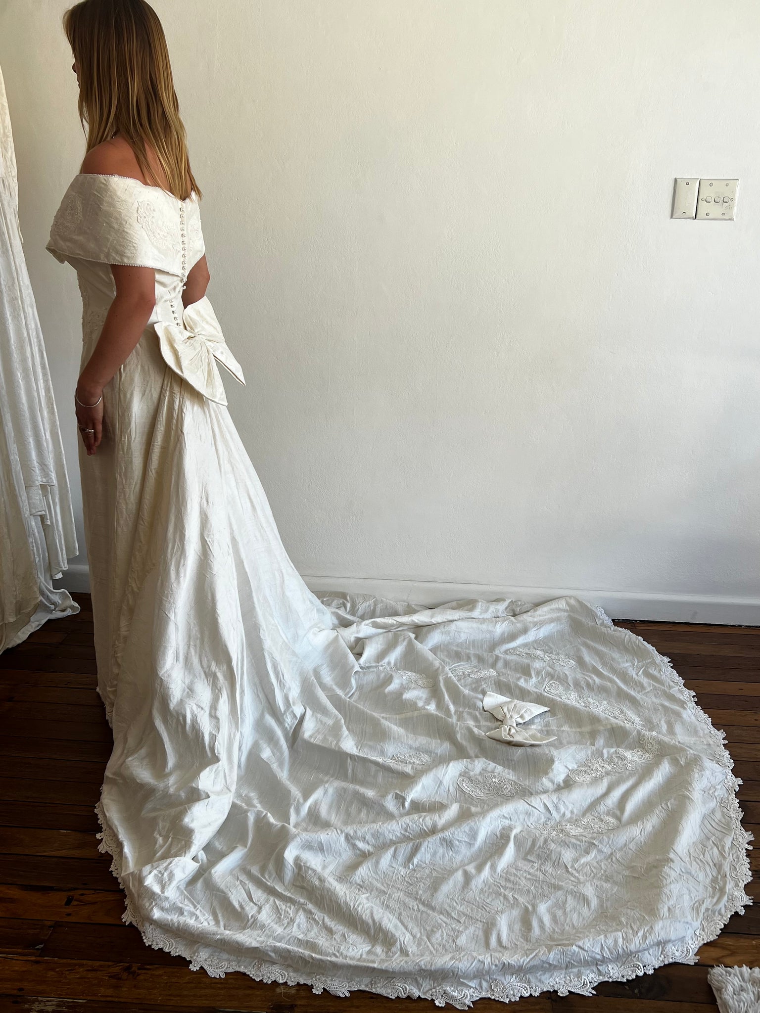 80s Raw Silk Off-the-shoulder Column Dress with Detachable Train
